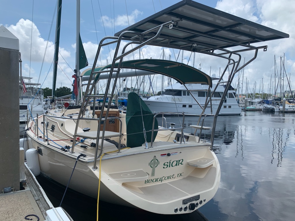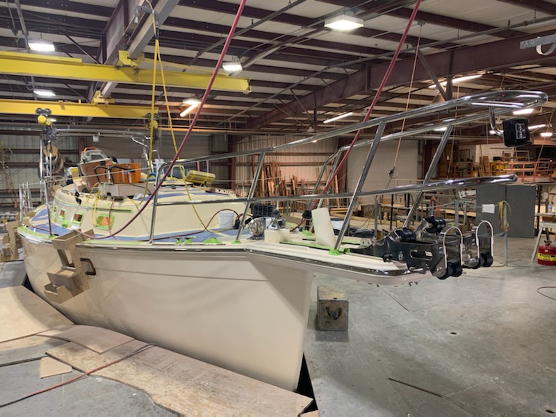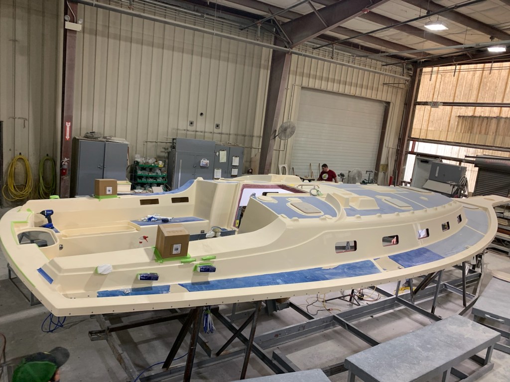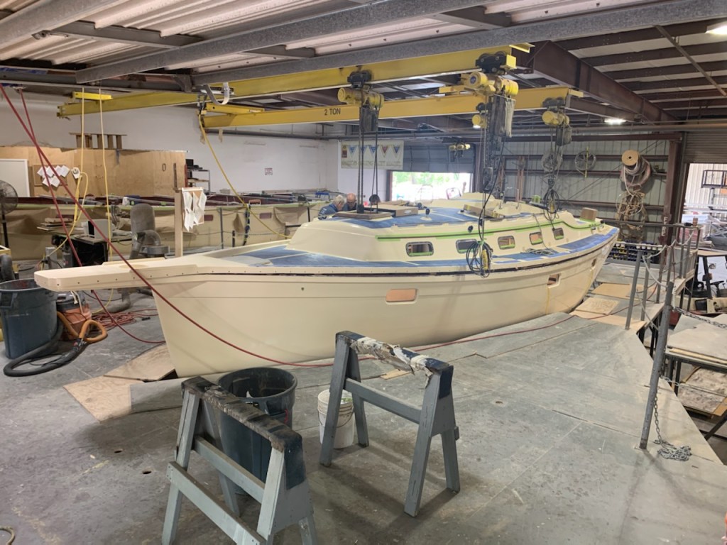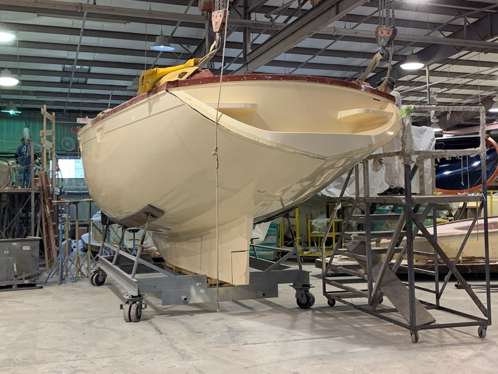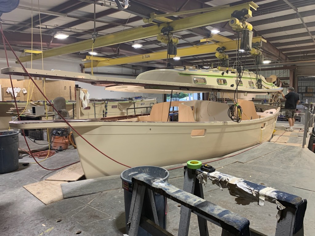 View from below decksFitting out the deckA little teak trim (Allison enjoys varnishing)One happy first mate!Under construction, looking starboardPretty pieces, prior to varnishCabin sole prior to installationAlmost wholeAll put togetherInterior trim-out, starboard, looking forwardInterior trim-out, starboard, looking aftBow rail addedReady for her close-up (and nights on the hook)Stern view, under constructionStern view, preparing to depart the factory for Launch DayStern view, all decked out and ready to sail
